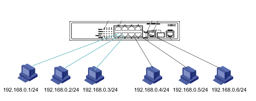 STEP 1:图示搭建网络环境,每 6 人为一组,均通过网线连接在同一台交换机上,分别连接在交换机的 1-6 号口。为各计算配置 IP 地址(网关可以暂时不配),要求在同一网段,然后用 ping 命令测试其连通性,六台计算机属于同一 VLAN 的情况,应该都能连通。