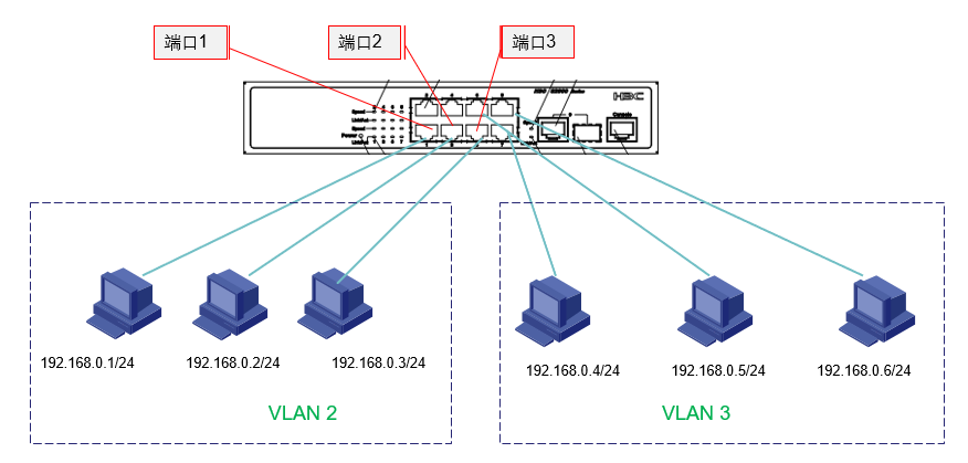 ping指令测试连通性。 vlan 11:创建 VLAN 11vlan 11:进入 VLAN 11port ethernet 1/0/3 to ethernet 1/0/4:将 3~4 端口接入到 VLAN11 内quit:退出 VLAN 11- 3、4 电脑互相